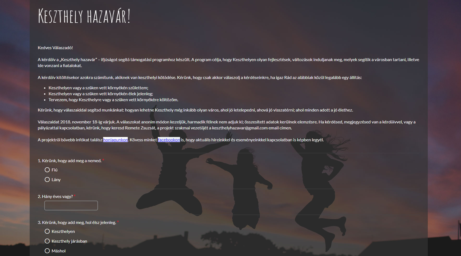 A kérdőív kitöltésekor azokra számítunk, akiknek van keszthelyi kötődése. Kérünk, hogy csak akkor válaszolj a kérdéseinkre, ha igaz Rád az alábbiak közül legalább egy állítás: